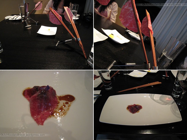 The liquid nitrogen frozen wagyu was actually placed in front of us before the lobster dish came out to “defrost”. Two courses later, the wagyu was ready and the waiter laid the wagyu over a bed of morel mushrooms. Ok, so the beef was great. The mushrooms were good. But once laid out, there really wasn’t all that much and it was finished in an enjoyable but short two bites.