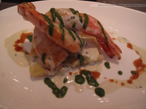 Tiger prawns with crushed potatoes and AOC olive oil, tarragon mustard black truffle sauce