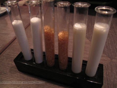 The coffee condiments came out in test tubes and the milk was nice and warm. The coffee itself smelt and tasted good.