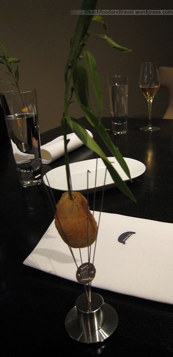 Another special dish. A bowl in a bowl. The outer bowl had a bunch of mint leaves in them, and the inner bowl was like a lobster soup. As the waiter poured hot water into the outer bowl, the mint vapour was revealed and hit our noses. The lobster pieces in the foam were sweet and tender and surrounded a green blob of peas. A green blob of peas? Yes… within a round green delicate casing, was liquified peas. As you popped this into your mouth and bite into it, remember to close your mouth because otherwise the surprise explosion will go all over the place. Excellent stuff!!