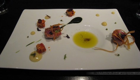 This was a strange one to me. There was sweet, there was savory, and then they mixed. The dish was layed on a pillow of lavender scented air which was released into the surroundings via the weight of the plate. While the lavender smelt great, I’m not so sure that the dish worked well for me.