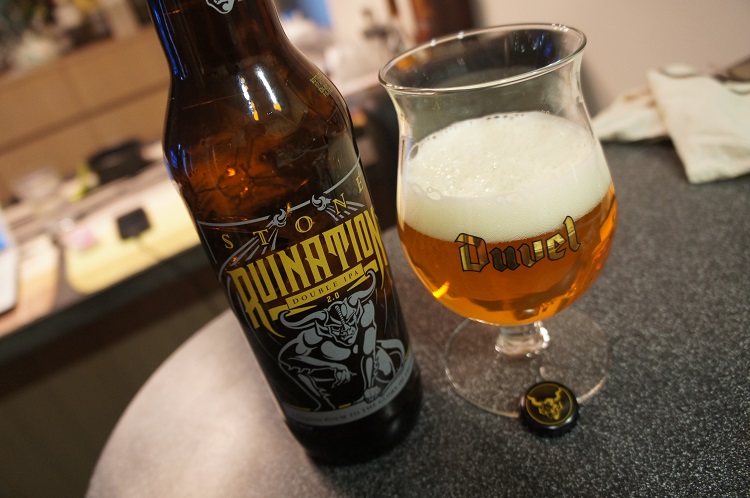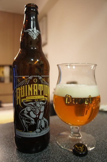 Brewer Description: (from bottle) When this double IPA first hit the scene in 2002, the hoppy beer landscape was far different that it is today. Ales offering an onslaught of resinous humulus lupulus were virtually unknown. Thankfully that is no longer the case. Terms such as “lupulin” and “IBU” are well established in the craft beer lexicon. And with the knowledge of all that hops have to offer comes the desire to go beyond bracing bitterness. Fortunately, Stone Ruination IPA has always been crafted to celebrate all facets of the hop – its beauty and poetry, its boldness and might. As craft beer has evolved, so too have techniques for extracting the best and the most out of hops. So we modernized Stone Ruination IPA, coaxing every last drop of piney, citrusy, tropical essence from the Centennial, Citra, Simcoe and Azacca hops that give this beer its incredible character. Join us in cheering this, the second stanza in our “Liquid Poem to the Glory of the Hop.”