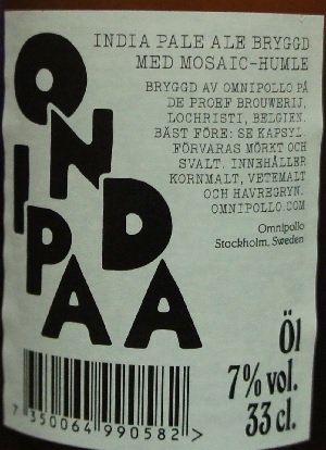 Brewer Description: (from website) Our second tribute to Sweden’s most prolific rapper. Onda 100% Mosaic IPA.