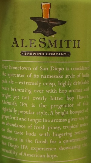 Brewer Description: (from can) Our hometown of San Diego is considered the epicenter of its namesake style of India Pale Ale – extremely crisp, highly drinkable beers brimming over with hop aromas and bright yet not overly bitter hop flavors. AleSmith IPA is the progenitor of this rightfully popular style. A bright bouquet of grapefruit and tangerine aromas gives way to an abundance of fresh piney, tropical notes on the taste buds with lingering resinous sensations in the finish for quintessential San Diego IPA experience showcasing the versatility of American hops.