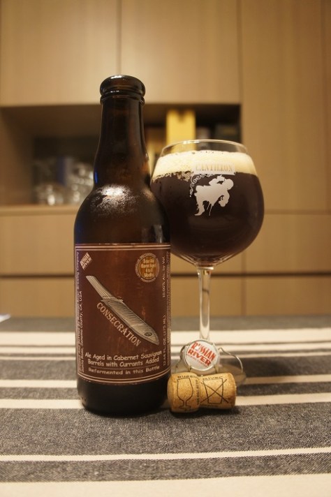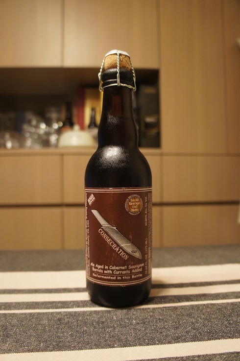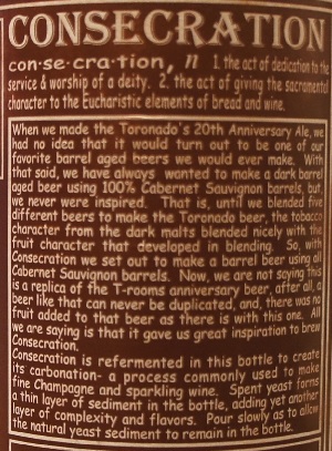 Brewer Description: (from bottle) con.se.cra.tion, n 1. The act of dedication to the service & worship of a deity. 2. The act of giving the sacramental character to the Eucharistic elements of bread and wine. When we made the Toronado’s 20th Anniversary Ale, we had no idea that it would turn out to be one of our favorite barrel aged beers we would ever make. With that said, we have always wanted to make a dark barrel aged beer using 100% Cabernet Sauvignon barrels, but, we never were inspired. That is, until we blended five different beers to make the Toronado beer, the tobacco character from the dark malts blended nicely with the fruit character that developed in blending. So, with Consecration we set out to make a barrel beer using all Cabernet Sauvignon barrels. Now, we are not saying this is a replica of the T-rooms anniversary beer, after all, a beer like that can never be duplicated, and, there was no fruit added to that beer as there is with this one. All we are saying is that it gave us great inspiration to brew Consecration. Consecration is refermented in this bottle to create its carbonation- a process commonly used to make fine Champagne and sparkling wine. Spent yeast forms a thin layer of sediment in the bottle, adding yet another layer of complexity and flavors. Pour slowly as to allow the natural yeast sediment to remain in the bottle.