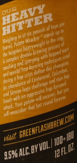 Brewer Description: (from bottle) Our heavy hitter. Weighing in at six pounds of hops per barrel, Palate Wrecker stands up to the hoppiest heavyweight in the ring. A complex double-brewing process of mashing and sparging with hopped wort and special hop layering techniques used during a hop crisis define this champion. An abundance of Centennial, Columbus and Simcoe hops challenge and stun hop heads with an aggressive hop-forward attack. Your palate will recover, but you will remember that last round forever.