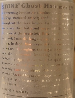 Brewer Description: (from can) A fermenting beer never slumbers. Consequently, there is always scattered activity tending our precious beers throughout the dark hours. In these late nights and wee hours that hallowed responsibility fall to the shoulders of the overnight Brew Crew. These brewing vanguards brave the long nights, often alone, to do what needs to be done. Most areas of the brewery are dark or in shadows. Throughout the night the cellars resonate with the occasional knocking of expanding and contracting pipes. It can be a bit spooky to hear the brewery creak and groan as if possessed by a spirit randomly knocking about with a mallet. This IPA, brewed with a striking array of hops, honors our intrepid overnight team by naming it after their mischievous poltergeist companion – the Ghost Hammer.