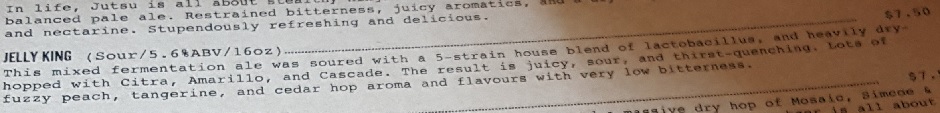 Brewer Description: (from website & menu) This mixed fermentation ale was soured with a 5-strain house blend of lactobacillus, and heavily dry-hopped with Citra, Amarillo, and Cascade. The result is a juicy, sour and thirst-quenching. Lots of fuzzy peach, tangerine, and cedar hop aroma and flavours with very low bitterness.