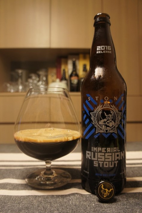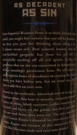 Brewer Description: (from bottle) As it stands, the classic version of Stone Imperial Russian Stout is deep, dark , rich, roasty and perhaps even a bit sinful. The “Odd Beers for Odd Years” part of the journey means the coming of each odd-numbered year provides the opportunity to take this traditional beer to new and mysterious places, embarking on an exploratory odyssey enabled by strikingly flavorful elements applied to a lovely onyx canvas. This beer, the latest “Odd” transubstantiation, takes inspiration straight from the spice aisle, incorporating an array of ingredients assembled to emulate the flavors of authentic chai tea. Cinnamon, cardamom, clove, ginger, a dash of black pepper and a dose of black tea combine with Stone Imperial Russian Stout’s incumbent flavors to take it deep into exotic, previously unfathomed territory. Expect a touch of earthiness in combination with a warm, tantalizing spiciness. As a one-time brew with enduring character, Stone CHAI-SPICED Imperial Russian Stout is crafted to be contemplated fresh or cellared under proper conditions for many years so that it may live on not only in one’s memory, but on his or her taste buds as well.
