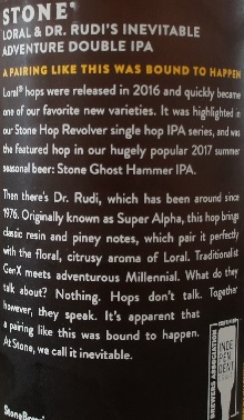 Brewer Description: (from bottle) A pairing like this was bound to happen. Loral hops were released in 2016 and quickly became one of our favorite new varieties. It was highlighted in our Stone Hop Revolver single hop IPA series, and was the featured hop in our hugely popular 2017 summer seasonal beer: Stone Ghost Hammer IPA. Then there’s Dr. Rudi, which has been around since 1976. Originally known as Super Alpha, this hop brings classic resin and piney notes, which pair it perfectly with the floral, citrusy aroma of Loral. Traditionalist GenX meets adventurous Millennial. What do they talk about? Nothing. Hops don’t talk. Together however, they speak. It’s apparent that a pairing like this was bound to happen. At Stone, we call it inevitable.