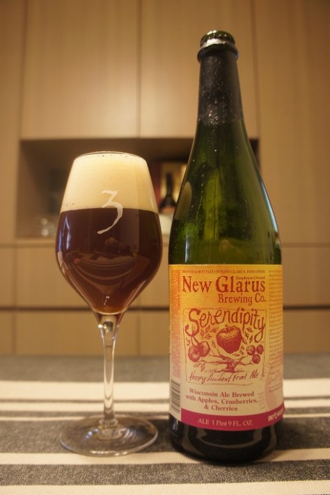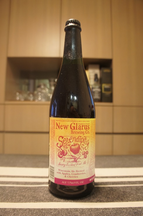 Brewer Description: (from bottle) Severe drought, we shared the farmer’s horror as Wisconsin’s cherry crop failed! Dan bought what cherries he could. The apple crop fared better. Then joy! A grand Wisconsin cranberry harvest. What will Dan brew with apples, cranberries and cherries? Oh my! You hold the happy accident of Wisconsin’s favorite fruit aged in oak with an almost magical wild fermentation. Serendipity is a wondrous celebration that sparkles your senses and dances across your palate. A kaleidoscope of flavor discovered by accident in a sour ale! Cheers to the unexpected.