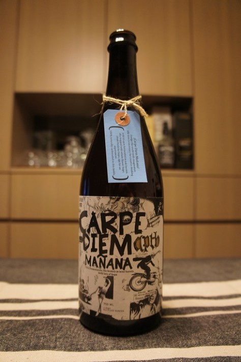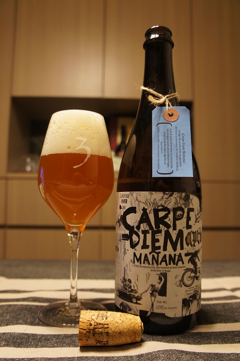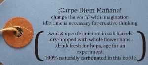 Brewer Description: (from tag on bottle) Carpe Diem Mañana – change the world with imagination – idle time is necessary for creative thinking. (* wild & open fermented in oak barrels. * dry-hopped with whole flower hops. * drink fresh for hops, age for an experiment. * 100% naturally carbonated in this bottle.)