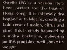 Brewer Description: (from can) Gweilo IPA is a session style beer, perfect for the heat of Hong Kong. It is intensely dry hopped with Mosaic, creating a bold nose of melon, citrus and pine. This is nicely balanced by a malty backbone, delivering an IPA punching well above its weight.
