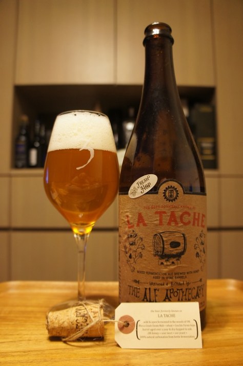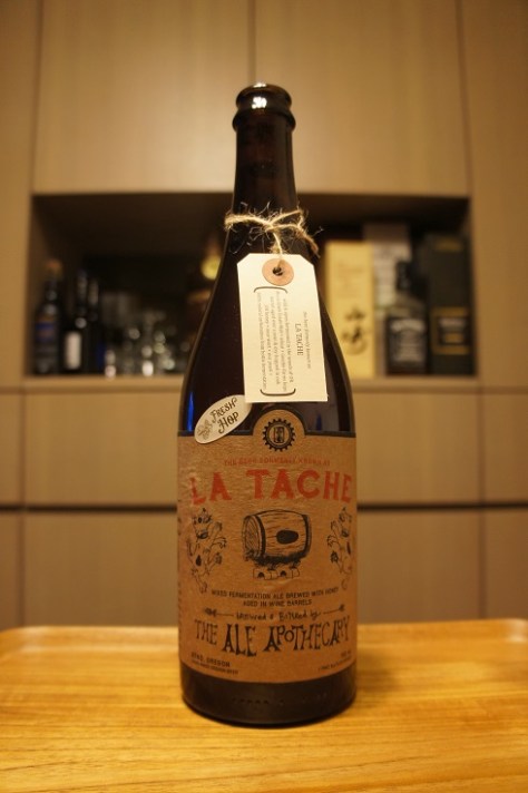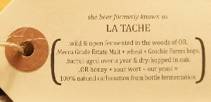 Brewer Description: (from tag on bottle) the beer formerly known as La Tache. (* wild & open fermented in the woods of OR. * Mecca Grade Estate Malt + wheat + Goshie Farms hops. * barrel-aged over a year & dry-hopped in oak. * OR honey + sour wort + our yeast = 100% natural carbonation from bottle fermentation.)