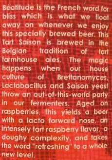 Brewer Description: (from bottle) Béatitude is the French word for bliss which is what we float away on whenever we enjoy this specially brewed beer. This Tart Saison is brewed in the Belgian tradition of tart farmhouse ales. The magic happens when our house culture of Brettanomyces, Lactobacillus and Saison yeast throw an out-of-this world party in our fermenters. Aged on raspberries, this yields a beer with a lacto forward nose, an intensely tart raspberry fruit flavor, a doughy complexity, and takes the word “refreshing” to a whole new level.