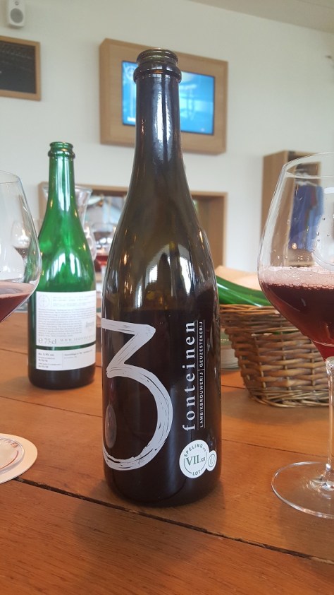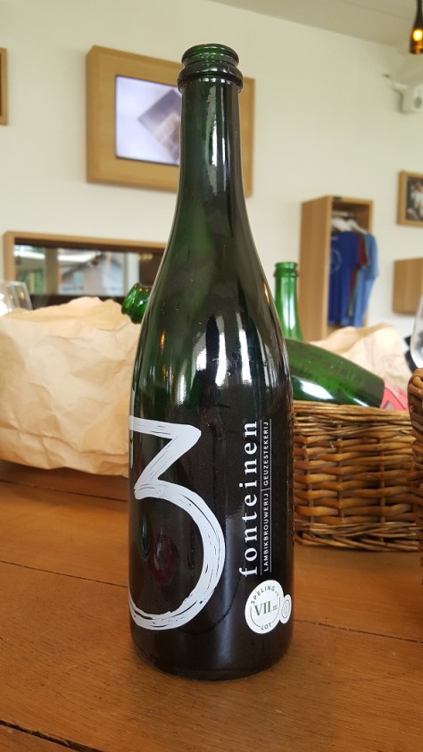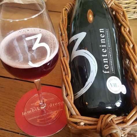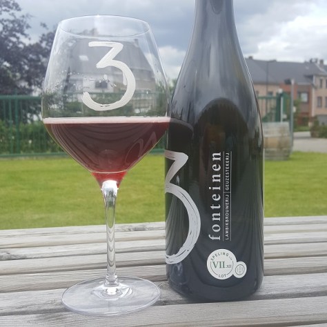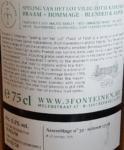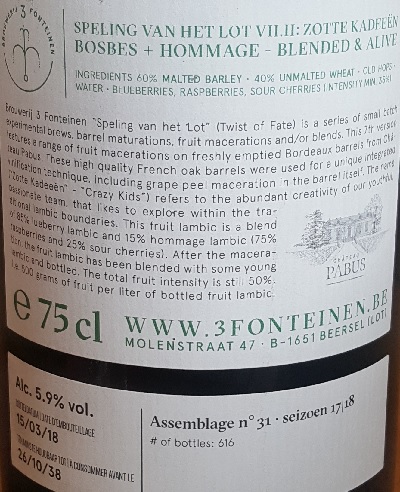Brewer Description: (from bottle) Brouwerij 3 Fonteinen “Speling van het Lot” (Twist of Fate) is a series of small batch experimental brews, barrel maturations, fruit macerations and/or blends. This 7th version features a range of fruit macerations on freshly emptied Bordeaux barrels from Château Pabus. These high quality French oak barrels were used for a unique integrated vinification technique, including grape peel maceration in the barrel itself. The name (“Zotte Kadeeën” – “Crazy Kids”) refers to the abundant creativity of our youthful, passionate team, that likes to explore within the traditional lambic boundaries. This fruit lambic is a blend of 50% blackberry lambic and 50% Hommage lambic (75% raspberries and 25% sour cherries). After the maceration, the fruit lambic has been blended with young lambic and bottled. The total fruit intensity is still 48%, i.e. 480 grams of fruit per liter of bottled fruit lambic.