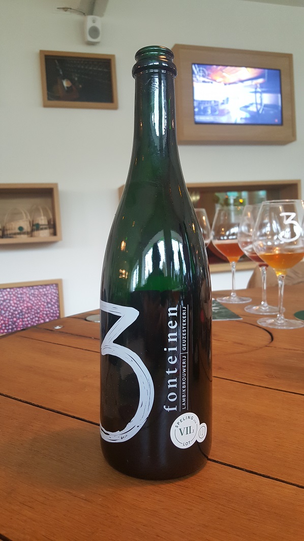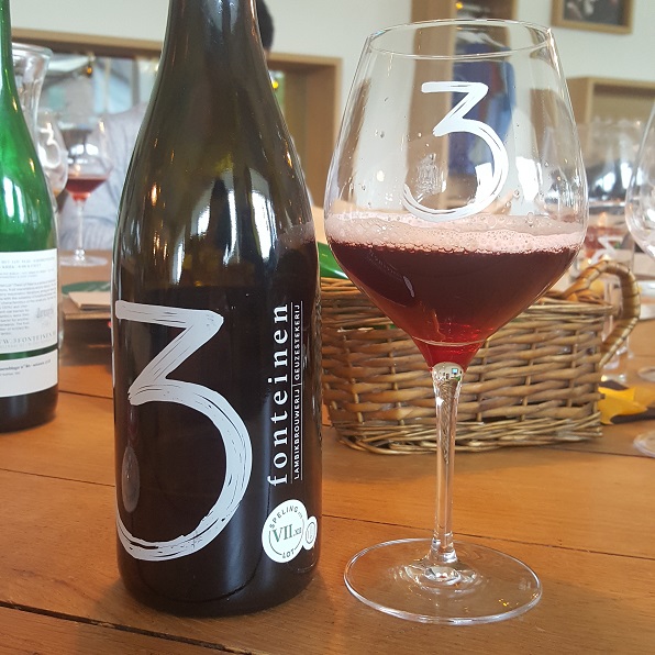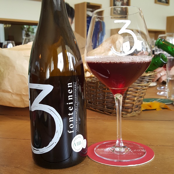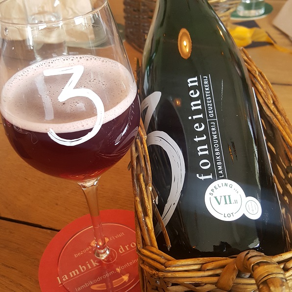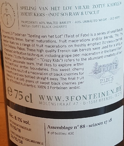 Brewer Description: (from bottle) Brouwerij 3 Fonteinen “Speling van het Lot” (Twist of Fate) is a series of small batch experimental brews, barrel maturations, fruit macerations and/or blends. This 7th version features a range of fruit macerations on freshly emptied Bordeaux barrels from Château Pabus. These high quality French oak barrels were used for a unique integrated vinification technique, including grape peel maceration in the barrel itself. The name (“Zotte Kadeeën” – “Crazy Kids”) refers to the abundant creativity of our youthful, passionate team, that likes to explore within the traditional lambic boundaries. This fruit lambic is a blend of 50% blackberry lambic and 50% Hommage lambic (75% raspberries and 25% sour cherries). After the maceration, the fruit lambic has been blended with young lambic and bottled. The total fruit intensity is still 48%, i.e. 480 grams of fruit per liter of bottled fruit lambic.