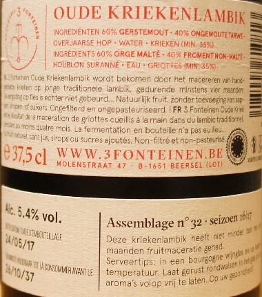 (translated to English) 3 Fonteinen Oude Kriek is the result of maceration of hand-picked sour cherries in traditional lambic for at least four months. The bottled fermentation did not take place … Natural fruit, without juice, syrups or added sugars. Unfiltered and unpasteurized.