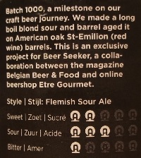 Brewer Description: (from bottle) Batch 1000, a milestone on our craft beer journey. We made a long boil blond sour and barrel aged it on American oak St-Emilion (red wine) barrels. This is an exclusive project for Beer Seeker, a collaboration between the magazine Belgian Beer & Food and online beershop Etre Gourmet.