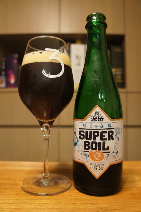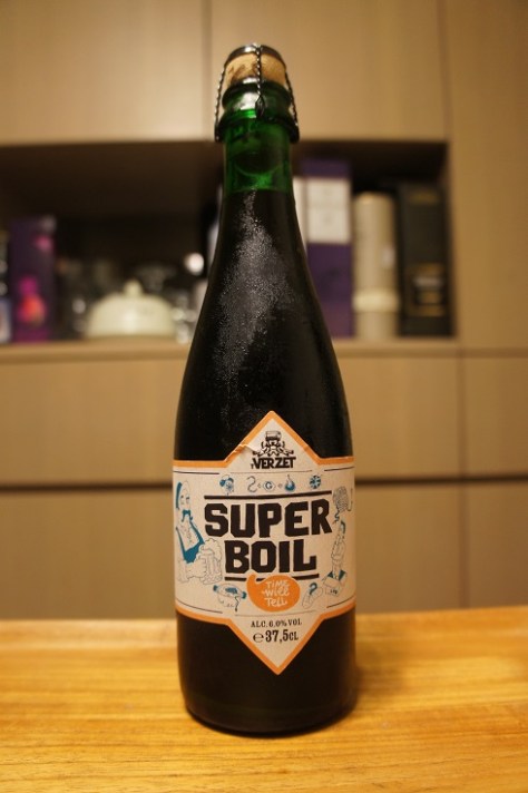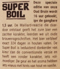Brewer Description: (from bottle in Dutch) Deze speciale editie van onze Oud Bruin wordt 16 uur gekookt, ipv de gangbare 1,5 uur. De Maillard-reactie die daardoor ontstaat geeft het zure bier een zachter karakter, leerden we uit oude brouwersgeschriften. Het bier verbleef exact 324 dagen in houten vaten. De Super Boil is beduidend donkerder van kleur dan de conventionele versie en heeft een ronder karakter, iets volmondiger. De geur en het aroma hebben iets vineus met hints van hout en vanille.