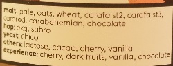 Other Notes: 51 IBUs. Malts – Pale, Oats, Wheat, Carafa st2, Carafa st3, Carared, Carabohemian and Chocolate. Hops – Ekg and Sabro. Yeast – Chico. Others – Lactose, Cacao, Cherry and Vanilla. Experience – Cherry, dark fruits, vanilla, chocolate
