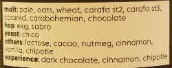 Other Notes: 51 IBUs. Malts – Pale, Oats, Wheat, Carafa st2, Carafa st3, Carared, Carabohemian and Chocolate. Hops – Ekg and Sabro. Yeast – Chico. Others – Lactose, Cacao, Nutmeg, Cinnamon, Vanilla and Chipotle. Experience – Dark chocolate, cinnamon, chipotle