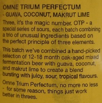 Brewer Description: (from bottle) Three, it’s the magic number. OTP – a special series of sours, each batch combining a trio of unusual ingredients based on the perfect principle of three elements. This batch we’ve combined a hand-picked selection of 12-18 month oak-aged mixed fermentation beer with guava, coconut, and makrut lime to create a blend bursting with juicy, sour, tropical flavours. Omne Trium Perfectum, no more no less – for some reason things just work better in threes.