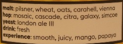 Other Notes: 23 IBUs. Malts – Pilsner, Wheat, Oats, Carahell and Vienna. Hops – Mosaic, Cascade, Citra, Galaxy and Simcoe. Yeast – London Ale III. Drink – Fresh. Experience – Smooth, juicy, mango, papaya