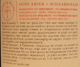 (translated to English) At Brouwerij 3 Fonteinen, a lot of things happen spontaneously. By mistake, but with surprising results, we assembled two barrels of Kriek lambic and Schaarbeekse Kriek lambic and put them together rather than separately. A small accident, but with a refined result. And as always, natural fruit, without juice, syrups or added sugars. Unfiltered and unpasteurized.