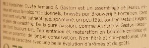 Brewer Description: (from bottle in French) 3 Fonteinen Cuvée Armand & Gaston est un assemblage de jeunes, mi-vieux et vieux lambic traditionnels, brassés par Brouwerij 3 Fonteinen. Cent pour cent naturel, authentique, spontané, un peu têtu, tout en restant élégant et plein de caractère. De la pure passion, comme Armand & Gaston Debelder l’ont toujours fait. Fermentation et maturation en bouteille continue et avec un potentiel de longue conservation. Non-filtré et non-pasteurisé. Une gueuze de caractère avec une belle évolution d’arômes et de goûts.