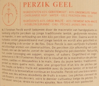 Brewer Description: (from bottle in Dutch) 3 Fonteinen Perzik wordt bekomen door de maceratie van handgeplukte en handmatig ontpitte perziken op jonge traditionele lambik, gedurende minstens vier maanden, in een verhouding van één kilo perziken per liter. Daarna wordt de fruitlambik verder geassembleerd met jonge lambik en wordt alles gebotteld en zet de vergisting zich verder in de fles. Deze Perzik is een verfijnde fruitlambik met uitbundige aroma’s van steenvruchten. De perziken zijn afkomstig van Ludo Rosseels, één van de laatste, zoniet de laatste Belgische perzikenteler. Natuurlijk fruit, zonder toevoeging van sappen, siropen, of suikers. Ongefilterd en ongepasteuriseerd.