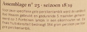 Voor deze specifieke gele perzikenlambik werd de variëteit Red Heaven gebruikt en gedurende 5 maanden gemacereerd op 3 Fonteinen lambik in een eikenhouten vat. De finale fruitintensiteit bedraagt 384 gram perziken per liter gele perzikenlambik.