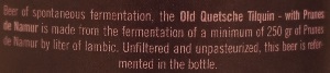 Brewer Description: (from bottle) Beer of spontaneous fermentation, the Old Quetsche Tilquin – with Prunes de Namur is made from the fermentation of a minimum of 250g of Prunes de Namur by liter of lambic. Unfiltered and unpasteurized, this beer is refermented in the bottle.