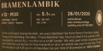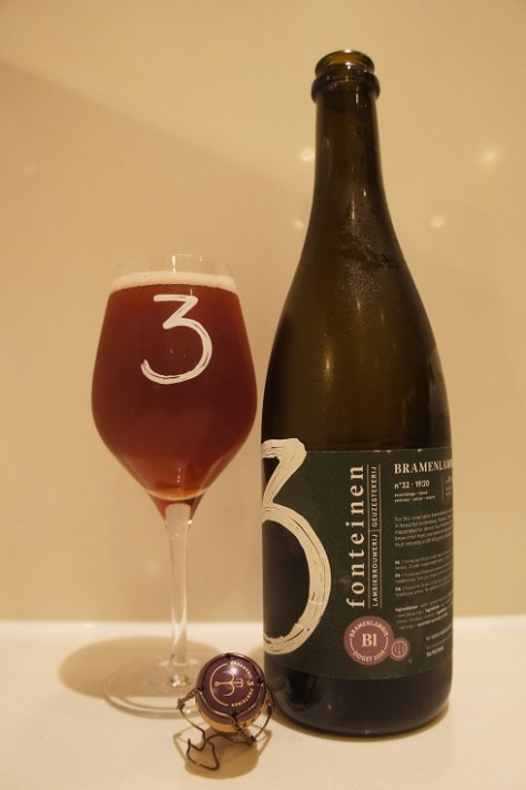 Brewer Description: (from bottle) For this small batch Bramenlambik, we used blackberries from Ferme Framboos, located in beautiful Huldenberg, Flanders. These blackberries, hand-picked in the summer of 2019, macerated for almost four months on a small foeder. We only used lambik (originating from one brew only) from one barrel for the maceration and no lambik was used for blending. The final fruit intensity is still 645 grams of blackberries per litre of Bramenlambik. 100% 3 Fonteinen.