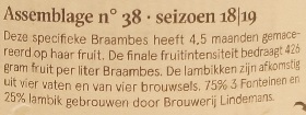 Deze specifieke Braambes heeft 4,5 maanden gemacereerd op haar fruit. De finale fruitintensiteit bedraagt 426 gram fruit per liter Braambes. De lambikken zijn afkomstig uit vier vaten en van vier brouwsels. 75% 3 Fonteinen en 25% lambik gebrouwen door Brouwerij Lindemans.