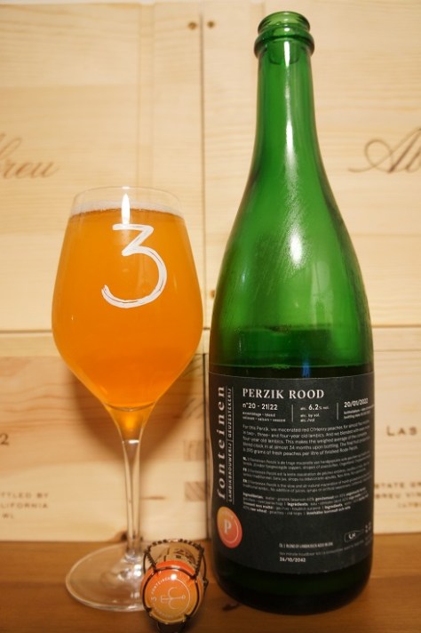 Brewer Description: (from bottle) For this Perzik, we macerated red O’Henry peaches for almost five months in two-, three- and four-year old lambics. And we blended with even more four-year old lambics. This makes the weighted average of the complete blend clock in at almost 34 months upon bottling. The final fruit proportion is 390 grams of fresh peaches per litre of finished Rode Perzik.