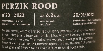 Brewer Description: (from bottle) For this Perzik, we macerated red O’Henry peaches for almost five months in two-, three- and four-year old lambics. And we blended with even more four-year old lambics. This makes the weighted average of the complete blend clock in at almost 34 months upon bottling. The final fruit proportion is 390 grams of fresh peaches per litre of finished Rode Perzik.