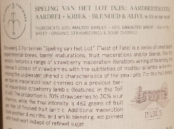 Brewer Description: (from bottle) Brouwerij 3 Fonteinen “Speling van het Lot” (Twist of Fate) is a series of small batch experimental brews, barrel maturations, fruit macerations and/or blends. This 9th version features a range of strawberry maceration iterations aiming at balancing the intense fruitiness of strawberries with the subtleties of traditional lambic while minimising the unpleasant phenolic characteristics of the small pits. For this fruit lambic we barrel macerated sour cherries on a previous barrel macerated strawberry lambic (featured in the ToF IX.viii). The proportion is 70% strawberries to 30% sour cherries, while the final intensity is 462 grams of fruit per liter of finished fruit lambic. Additional maceration took another 4 months, and while blending, we primed with fresh wort instead of refined sugar.