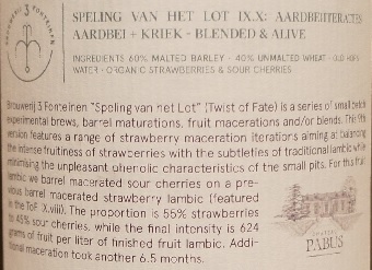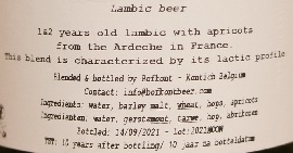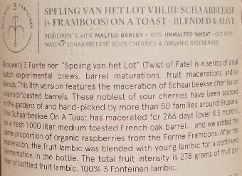 Brewer Description: (from bottle) Brouwerij 3 Fonteinen “Speling van het Lot” (Twist of Fate) is a series of small batch experimental brews, barrel maturations, fruit macerations and/or blends. This 14th version is a bottled 18-month old lambik that further carbonated in the bottle (a mono blend so you will) that was brewed on December 20th 2017. During such “Longest Night”, we add and infuse different ingredients on the four different coolships in our brewhouse in Beersel. One of those additions were fresh pine tree branches and needles, sourced in the garden of the mansion at Ukkelse Steenweg 327. This villa was previously owned by an employee of the former Van Haelen lambic brewery nearby. Recently, it featured the pop-up restaurant of Chef Maarten Van Essche, called “Wilder At The Villa”. Maarten, currently running restaurant Magma in Mechelen (www.magma.be), came up with the idea, inspired by previous experiences in Nordic cuisine… The Wilder logo was designed by Viktor Hachmang.