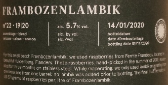 Brewer Description: (from bottle) For this small batch Frambozenlambik, we used raspberries from Ferme Framboos, located in beautiful Huldenberg, Flanders. These raspberries, hand-picked in the summer of 2019, macerated for three months on stainless steel. While macerating, we only used lambik originating from one brew and from one barrel; no lambik was added prior to bottling. The final fruit intensity is still 371 grams of raspberries per litre of Frambozenlambik.