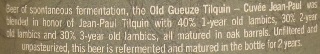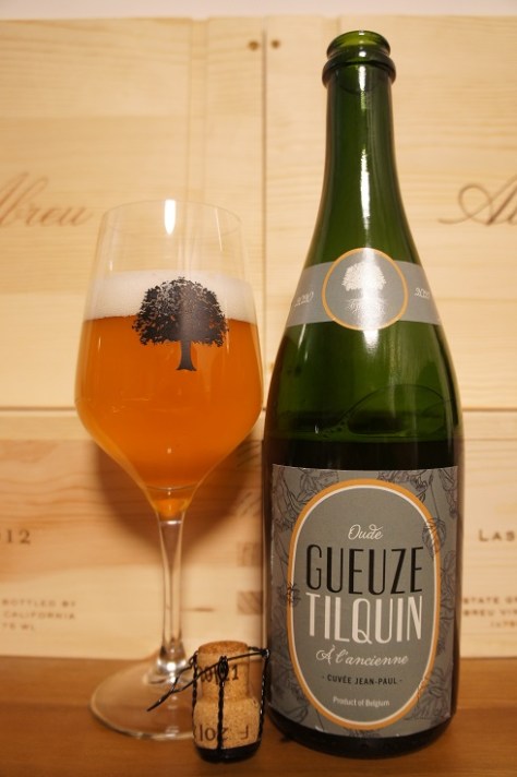 Brewer Description: (from bottle) Beer of spontaneous fermentation, the Old Gueuze Tilquin – Cuvée Jean-Paul was blended in honor of Jean-Paul Tilquin with 40% 1-year old lambics, 30% 2-year old lambics and 30% 3-year old lambics, all matured in oak barrels. Unfiltered and unpasteurized, this beer is refermented and matured in the bottle for 2 years.