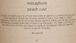 Brewer Description: (from bottle) This bright and playful beer is a fresh reminder of carefree summers and sings with a clear expression of one of my favourite summer fruits. It consists of a blend of spontaneous and mixed fermentation beers aged in oak barrels for over two years with fresh local peaches from two consecutive harvests. This fresh and fruity rustic beer with a sense of time and place is ready to be enjoyed here and now. Best shared in good company. Na zdravi! Jiří.