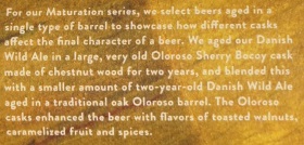 Brewer Description: (from bottle) For our Maturation series, we select beers aged in a single type of barrel to showcase how different casks affect the final character of a beer. We aged our Danish Wild Ale in a large, very old Oloroso Sherry Bocoy cask made of chestnut wood for two years, and blended this with a smaller amount of two-year-old Danish Wild Ale aged in a traditional oak Oloroso barrel. The Oloroso casks enhanced the beer with flavors of toasted walnuts, caramelized fruit and spices.
