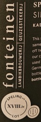 Brewer Description: (from bottle) This series of eight Spelingen van het Lot feature the ageing of the same lambikken on different wooden barrels. The lambikken come off two different brews, fully crafted with cereals sourced from our cereal collective and fully organic. The different wood types used are: American oak, German oak, acacia, the combination of German oak and acacia, chestnut, ash, cherry and mulberry. This bottle features the chestnut wood and was handbottled on 486 bottles.