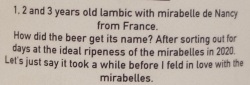 Brewer Description: (from bottle) 1, 2 and 3 years old lambic with Mirabelle de Nancy from France. How did the beer get its name? After sorting out for days at the ideal ripeness of the mirabelles in 2020. Let’s just say it took a while before I feld in love with the mirabelles.