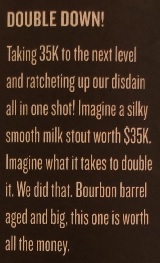 Brewer Description: (from bottle) Double Down! Taking 35K to the next level and ratcheting up our disdain all in one shot! Imagine a silky smooth milk stout worth $35K. Imagine what it takes to double it. We did that. Bourbon barrel aged and big, this one is worth all the money.