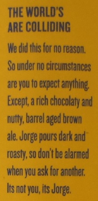 Brewer Description: (from bottle) The world’s are colliding. We did this for no reason. So under no circumstance are you to expect anything. Except, a rich chocolaty and nutty, barrel aged brown ale. Jorge pours dark and roasty, so don’t be alarmed when you ask for another. Its not you, its Jorge.
