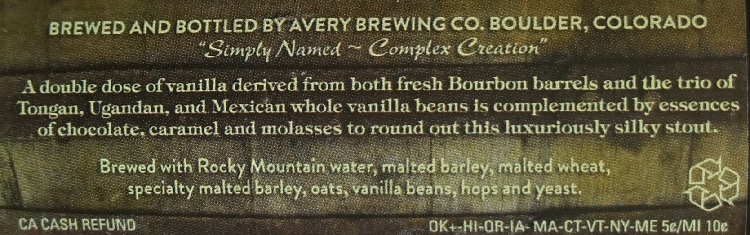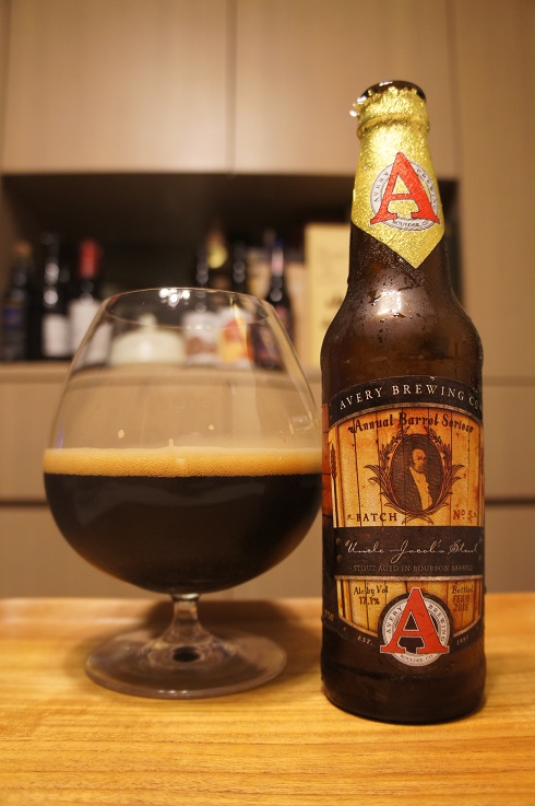 Brewer Description: (from bottle) Jacob Spears, our 6th Great Grand Uncle, is credited as the first distiller to label his whiskey “Bourbon”. He built his distillery in Bourbon County Kentucky in 1790 – 203 years before we began brewing. While obviously a bit too late to produce Uncle Jacob’s wash, we’ve instead created something far more complex. In his honor, we present this robust, silky smooth, full-bodied and altogether extremely American rendition of an Imperial Stout aged for 6 months in the very finest bourbon barrels. This explains a lot about our penchant for big brews! It’s in our blood!