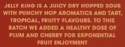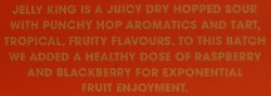 Brewer Description: (from website) Jelly King combines bright and juicy hop aromatics with a refreshingly tart base, and is bursting with notes of fuzzy peach, tangerine, and grapefruit. This limited edition Jelly King variant was conditioned on loads of cranberry and tangerine purée.
