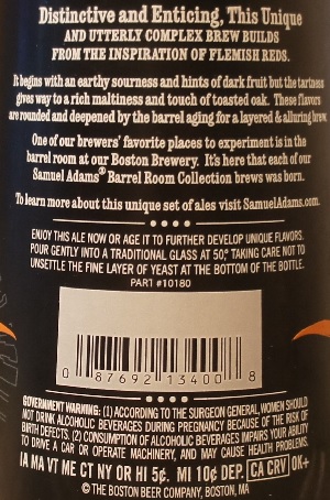 Brewer Description: (from bottle) Distinctive and enticing, this unique and utterly complex brew builds from the inspiration of Flemish reds. It begins with an earthy sourness and hints of dark fruit but the tartness gives way to a rich maltiness and touch of toasted oak. These flavors are rounded and deepened by the barrel aging for a layered & alluring brew. One of our brewers’ favorite places to experiment is in the barrel room at our Boston Brewery. It’s here that each of our Samuel Adams Barrel Room Collection brews was born.